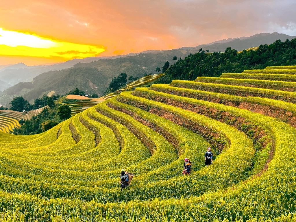Mù Cang Chải thu hút du khách bởi vẻ đẹp ngoạn mục của ruộng bậc thang. Nằm cách Hà Nội khoảng 300km, Mù Cang Chải là minh chứng cho sự hòa quyện giữa con người và thiên nhiên. Thời điểm lý tưởng nhất để chiêm ngưỡng vẻ đẹp này là mùa lúa chín, từ cuối tháng 9 đến giữa tháng 10. Khi ấy, những thửa ruộng khoác lên mình sắc vàng óng ả, tạo nên bức tranh thiên nhiên tuyệt đẹp.